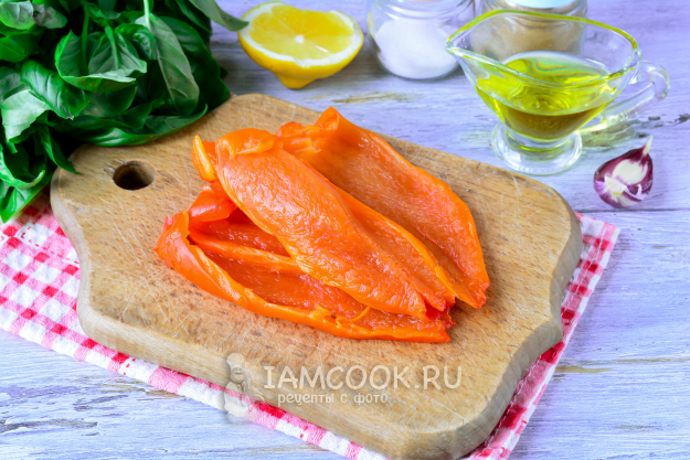 Очистите перец от кожуры и семян, чтобы осталась одна мякоть.