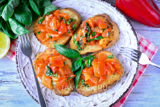 На хрустящую брускетту выложите начинку из печеного перца и сразу подавайте к столу. Закуска - просто отличная! Приятного вам аппетита!