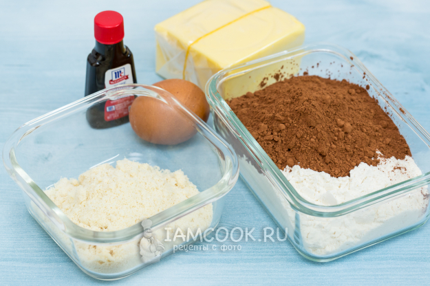 Для приготовления миндального шоколадного печенья подготовьте продукты по списку. И да, разрыхлителя в тесте нет.