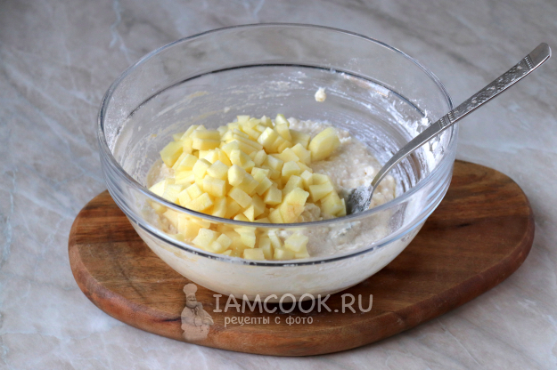 Яблоко помойте, очистите и удалите семенную коробочку. Мякоть яблока нарежьте мелкими кубиками и добавьте в тесто. Тесто снова перемешайте.