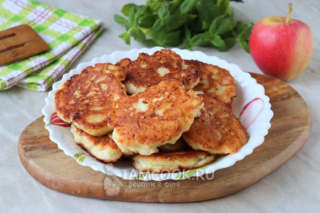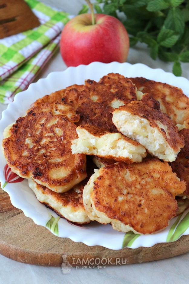 Вот и всё, пышные оладьи с творогом и яблоком готовы.