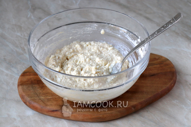 Тесто тщательно перемешайте. Учитывая, что мука и влажность творога у всех разные, количество муки может немного отличаться от указанного в списке продуктов, ориентируйтесь по консистенции, добавляя муку не всю сразу, а небольшими порциями. Творожное тесто для оладий должно получиться достаточно густым (как на фото), благодаря этому оладьи получатся пышными и не осядут после остывания.
