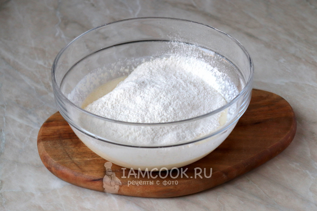 Затем введите просеянную пшеничную муку, смешанную с разрыхлителем.