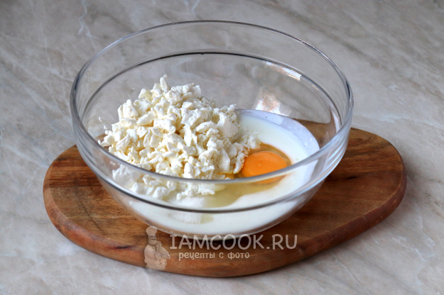 В глубокой миске соедините кефир комнатной температуры, сахарный песок, ванильный сахар, куриное яйцо и творог.