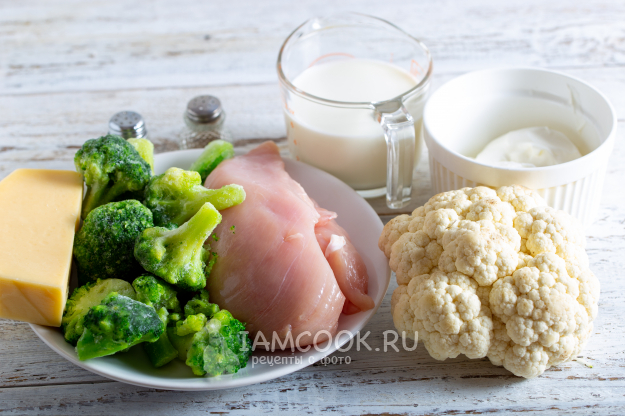 Возьмите указанные ингредиенты для приготовления запеканки из курицы с брокколи и цветной капустой в духовке. Для запекания подойдёт как свежая, так и замороженная капуста. Если овощи замороженные, то лучше им дать разморозиться. Сметану лучше взять 20-25% жирности. Подготовьте форму для запекания и включите разогреваться духовку до 180 градусов.