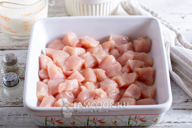 Куриное филе помойте под проточной холодной водой и обсушите бумажными полотенцами. Порежьте курицу небольшими кубиками и выложите в выбранную форму для запекания.
