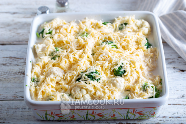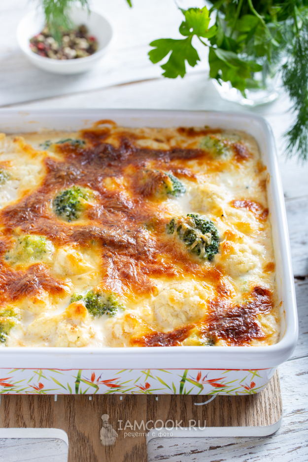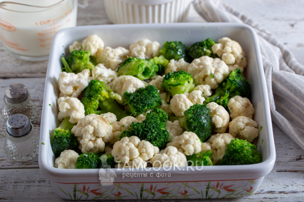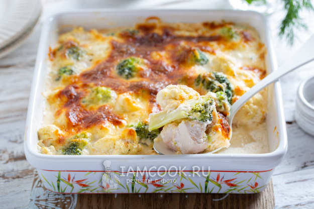 Брокколи разберите на соцветия и выложите к курице. Цветную капусту разберите на соцветия, опустите в кипящую воду на 2-3 минуты, и выложите в форму для запекания.