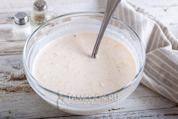 В глубокой посуде смешайте сметану, молоко, соль и специи - можно взять готовые наборы специй для курицы или свои любимые. Сыр натрите на тёрке и добавьте в молочно-сметанную смесь, перемешайте.