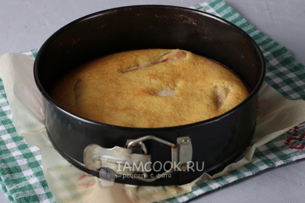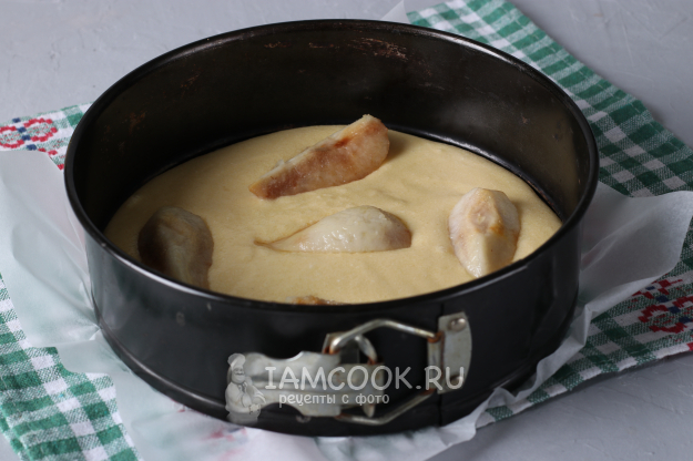 Дно формы застелить пергаментом, влить тесто. 4-5 ломтиков груш вынуть из сиропа, обсушить и выложить сверху теста. Разогреть духовку до 180 градусов и выпекать бисквит 30 минут.