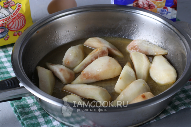 Груши очистить от кожуры, разрезать на 4 части и удалить семена.