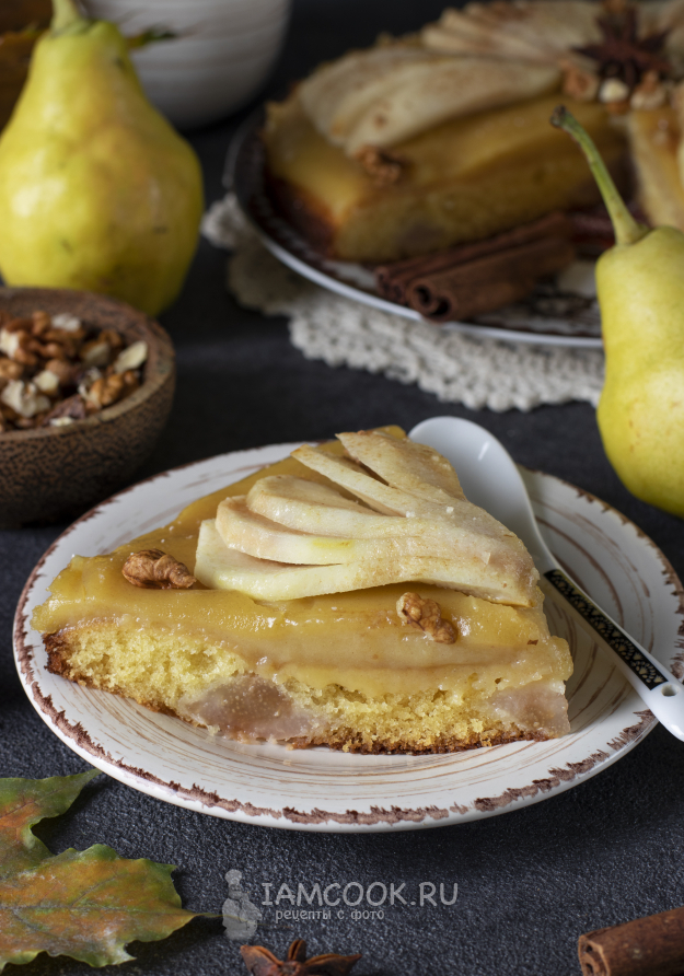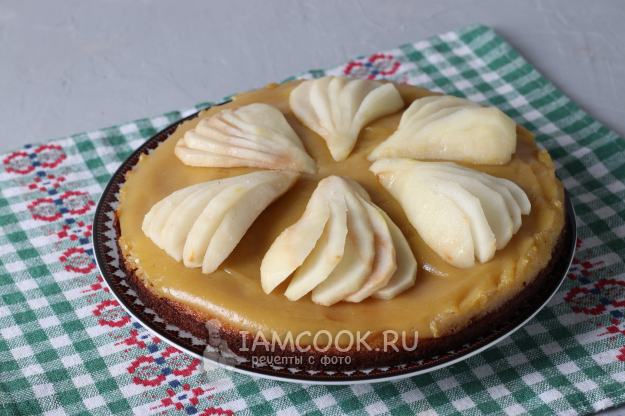Пирог вынуть из духовки, остудить в форме. Оставшиеся груши вынуть из сиропа, нарезать веером, начиная от широкой части, и произвольно разложить сверху пирога, слегка вдавливая в запечённый крем. Извлечь пирог из формы.
