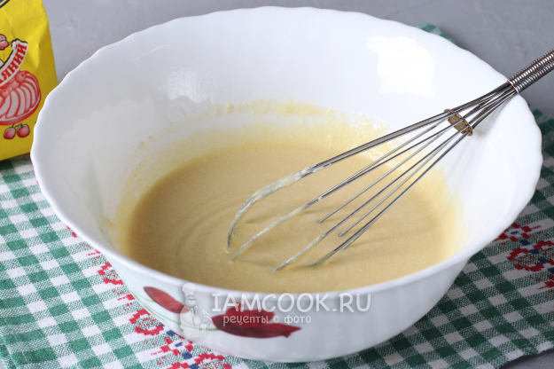 Яйцо взболтать в отдельной чашке до однородности, затем понемногу вводить его в сахарную смесь. Добавить в тесто просеянную муку с разрыхлителем и налить молоко. Тесто тщательно перемешать.
