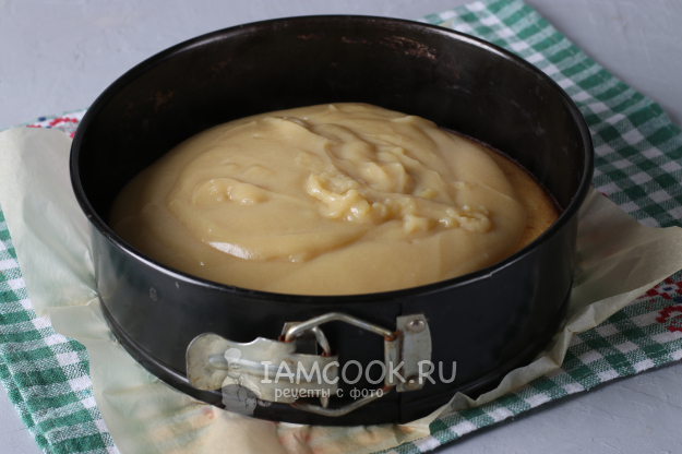 Переложить крем в форму поверх бисквита, разровнять лопаткой и поставить снова в духовку на 10 минут.