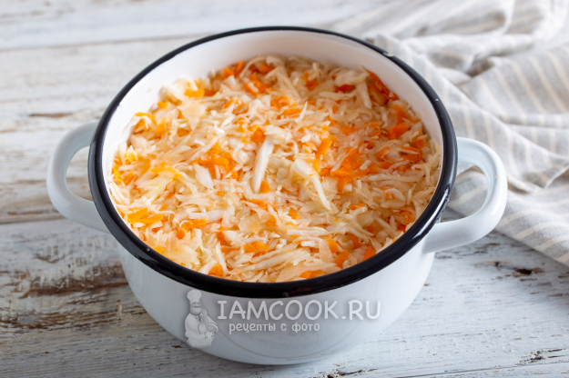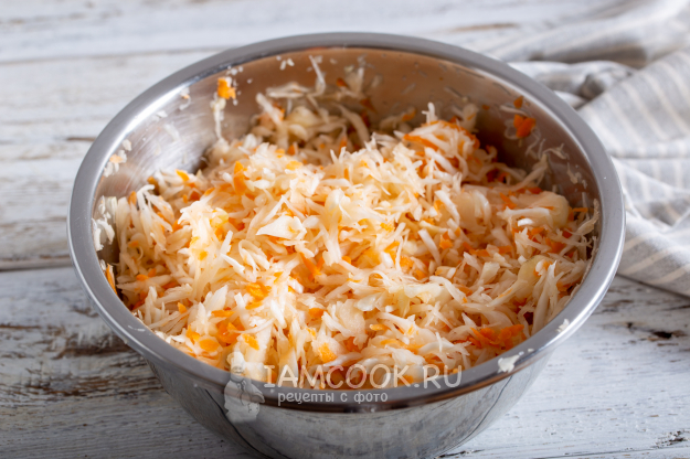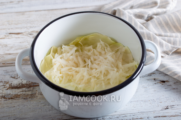 Добавьте капусту с морковью, затем снова редьку и оставшуюся капусту.