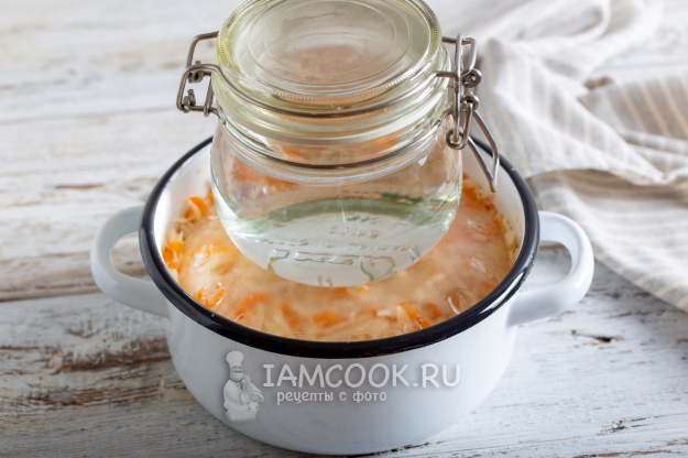 Накройте крышкой или тарелкой, сверху поставьте гнёт и держите капусту при комнатной температуре 48 часов. Спустя 2 дня проткните капусту в нескольких местах палочкой до самого дна, верните гнёт и оставьте еще на 48 часов. Затем капусту переложите в банки и уберите в холодильник.