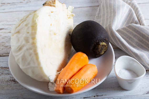 Возьмите указанные ингредиенты для приготовления квашеной капусты с редькой.