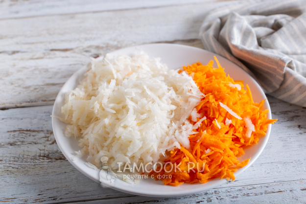 Морковь и редьку помойте и очистите от шкурки. Натрите овощи на крупной тёрке.