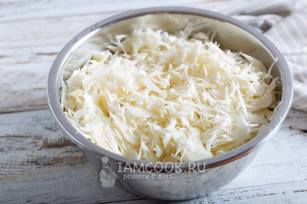 Капусту очистите, оставьте пару чистых верхних листьев, а остальное нашинкуйте. Сложите капусту в глубокую посуду и помните её руками, чтобы она пустила сок.