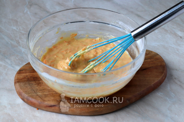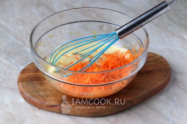 Морковь натрите на средней тёрке и добавьте в миску с яично-молочной смесью.