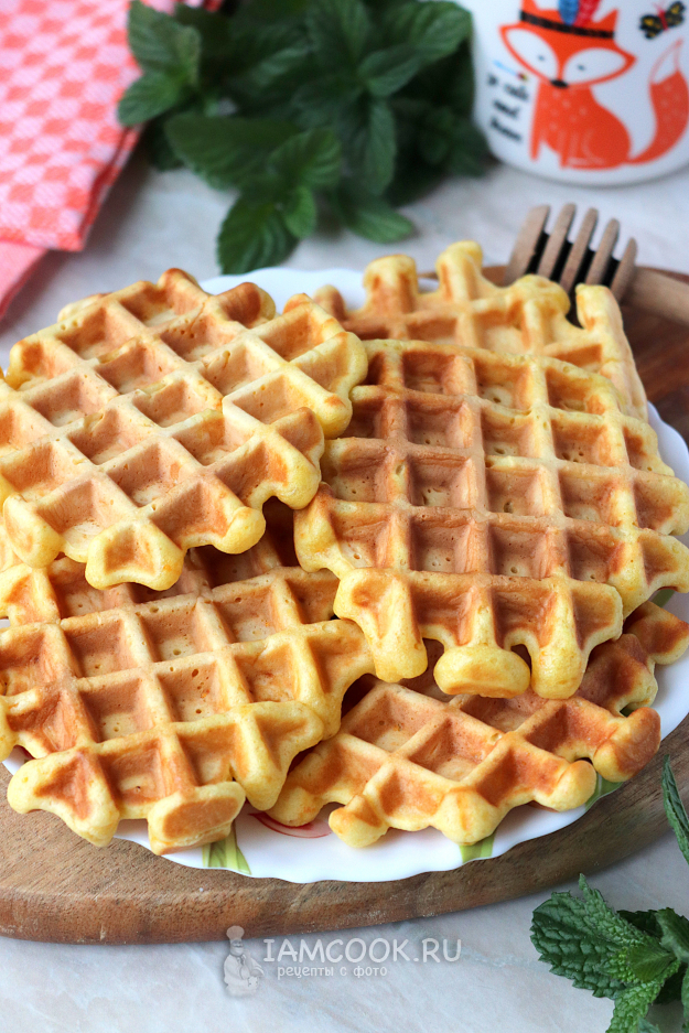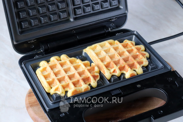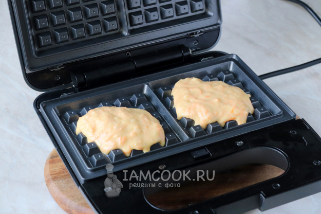 Вафельницу разогрейте, смажьте её панели тонким слоем растительного масла и выложите 1-1,5 столовых ложки теста на одну вафлю.