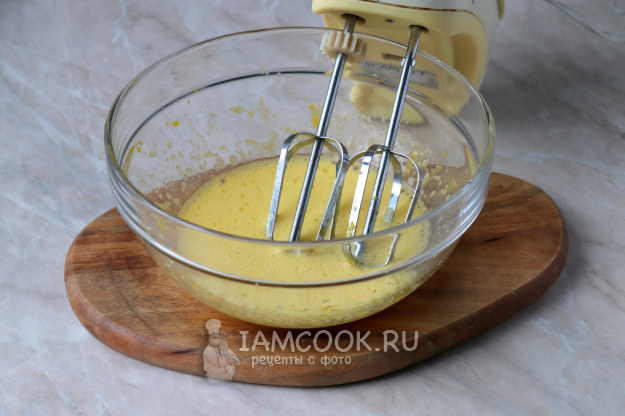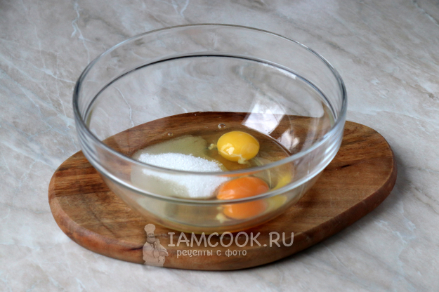 В глубокой миске соедините куриные яйца, сахарный песок и немного ванильного сахара, для аромата.