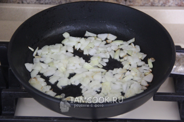 В сковороду влить немного масла и добавить мелко нарезанный лук. Обжарить лук до золотистого цвета при помешивании.