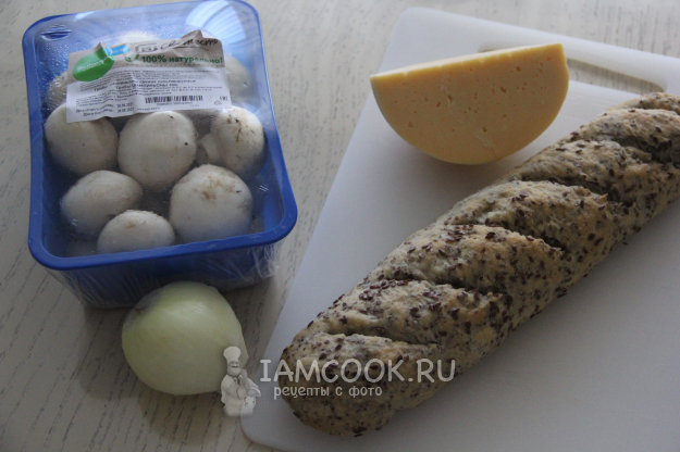 Приготовить продукты для гренок с грибами и сыром. Лук почистить, шампиньоны промыть под водой.