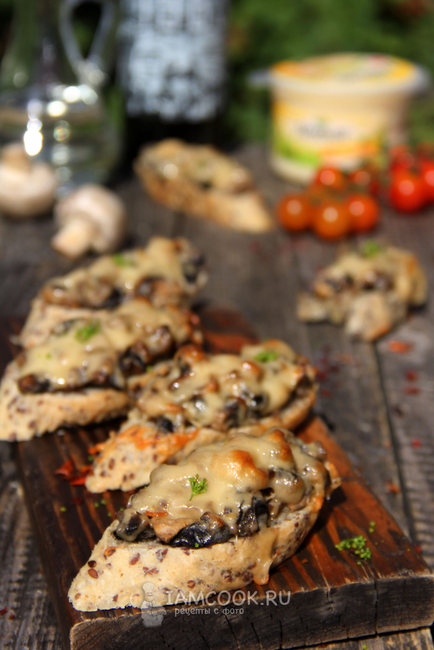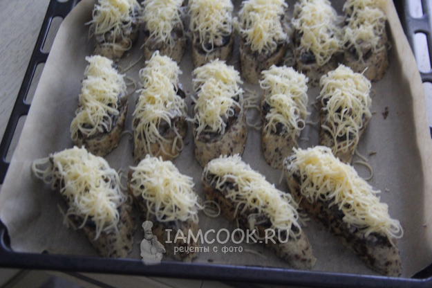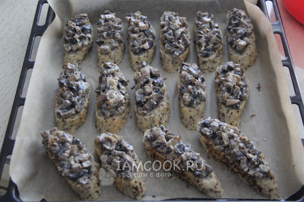 Противень застелить пергаментом, выложить кусочки хлеба. Поверх хлеба выложить грибную начинку.