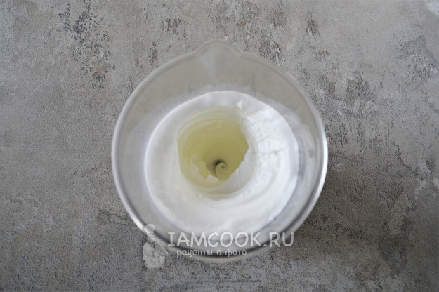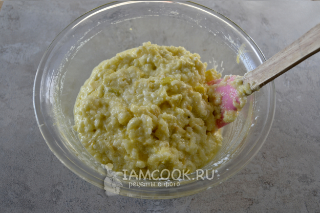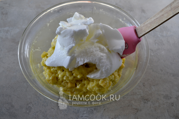 Лопаткой аккуратно, сверху вниз, вмешайте белки в тесто. Благодаря взбитым белкам рисовое тесто получается очень воздушным, легким.