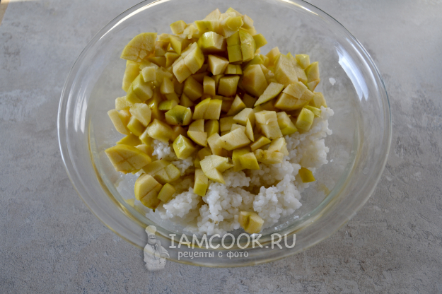 Переложите остывшую рисовую кашу в миску, добавьте нарезанные яблоки.