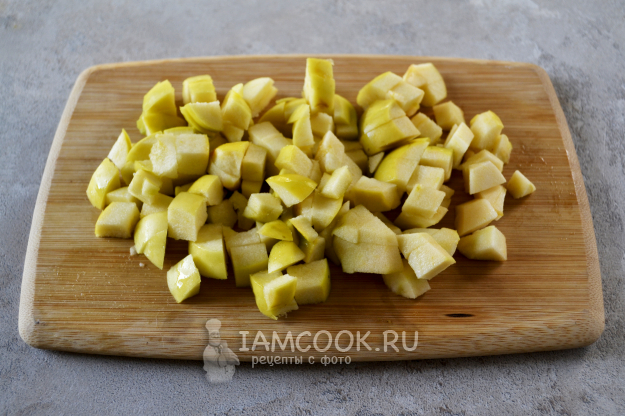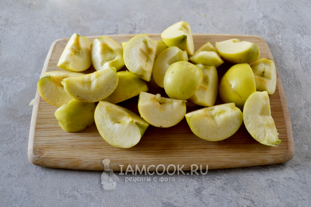 Яблоки вымойте, разрежьте на четвертинки. Удалите семенную коробочку.