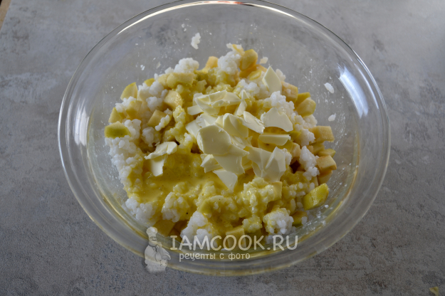 Добавьте мягкое сливочное масло, нарезанное на кусочки, и аккуратно перемешайте.
