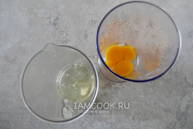 Разделите яйца на белки и желтки. Для белков используйте полностью сухую и чистую посуду.