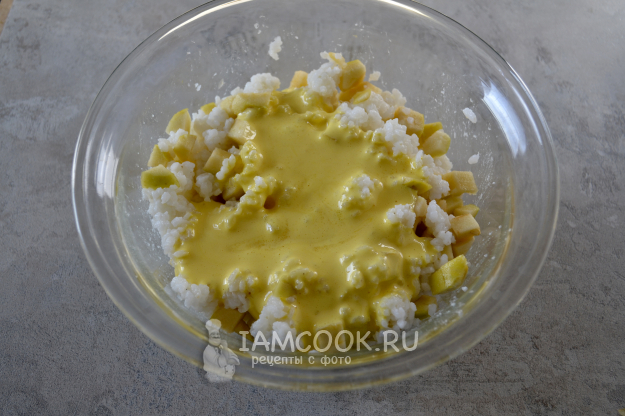 Перемешайте яблоки и рис, влейте взбитые с сахаром желтки.
