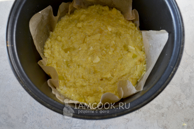 Застелите чашу мультиварки пекарской бумагой. Если не уверены в качестве бумаги, смажьте ее растительным маслом. Выложите всё тесто в чашу. Разровняйте поверхность будущего пудинга.