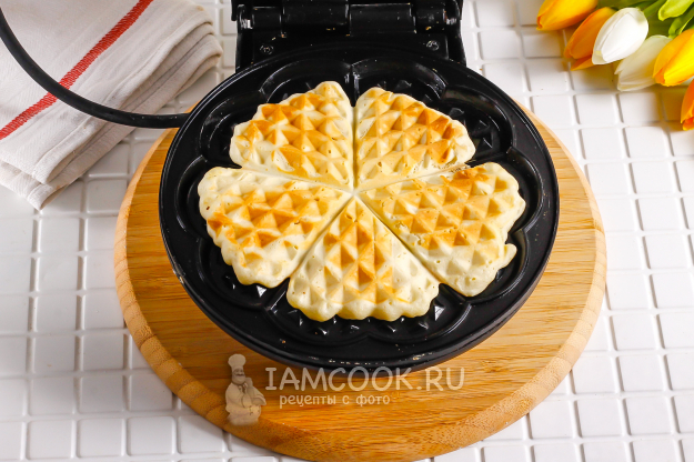 Прогрейте вафельницу и смажьте ее панели растительным маслом. Смазывайте только нагретые панели! Выложите в середину вафельницы 2 ст.л. теста и закройте крышку. Выпекайте сливочные вафли примерно 3-4 минут. Точно вам не скажу время - оно зависит от мощности вашей техники. В любом случае через 3 минуты никто не мешает вам проверить степень румяности выпечки и допечь ее.