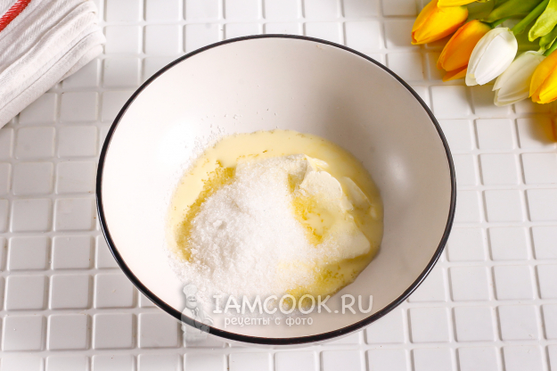 Сливочное масло или качественный маргарин растопите на водяной бане или в микроволновке, но не до кипения. Я не взбиваю куриное яйцо, но если вы привыкли его сначала взбивать, то сделайте это! Всыпьте в емкость к маслу сахар и соль. Можно добавить немного ванильного сахара или молотой корицы.