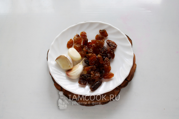 Промываем изюм (не обязательно класть изюм, добавляем по желанию изюм, чернослив, курагу или ничего не добавляем), чистим от покровных чешуй чеснок. Если головки чеснока небольшие, то кладем их целиком в рис на последнем этапе.