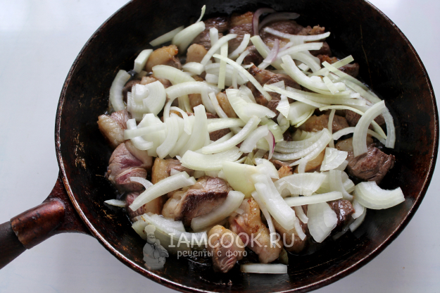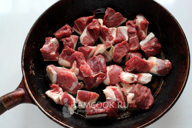 Мякоть баранины нарезаем среднего размера кусочками, разогреваем на сковороде немного масла и обжариваем мясо со всех сторон, помешивая его.