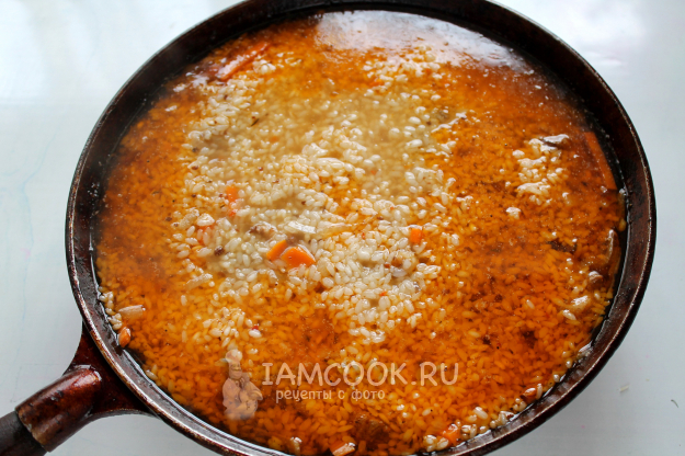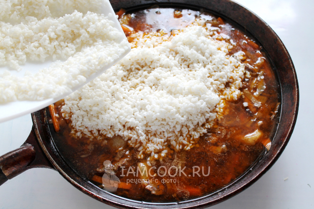 Теперь настала очередь ввести рис: сливаем всю воду и добавляем рис в зирвак.