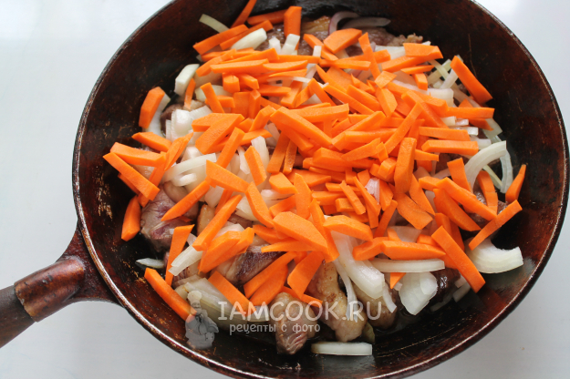 Кладем в плов морковь и продолжаем обжарку, слегка встряхивая сковороду.
