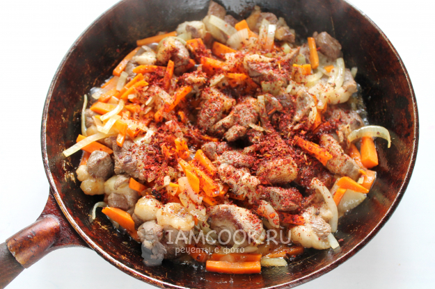 Добавляем приправу для плова, чтобы ее аромат перешел в жир.