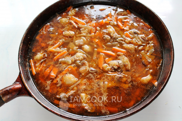 Заливаем обжаренное мясо с овощами кипятком, доводим до кипения и варим при медленном кипении до мягкости мяса. У меня была молодая баранина, я кипятила минут 30. Учтите, что вода частично испарится. В конце варки солим зирвак чуть больше, чем нужно (рис заберет лишнюю соль из бульона).