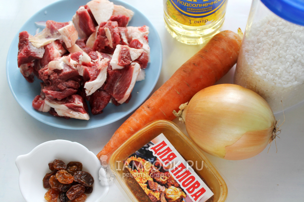 Возьмем продукты для приготовления рассыпчатого плова с бараниной на сковороде и приступим.