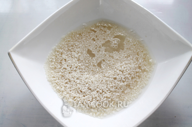 Рис хорошо промоем в нескольких водах и зальем теплой водой до момента его введения в блюдо.