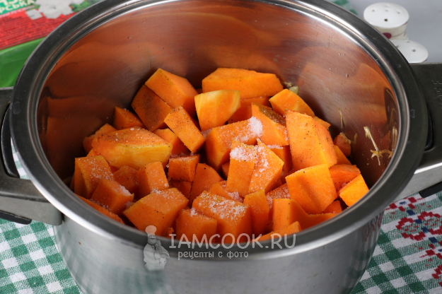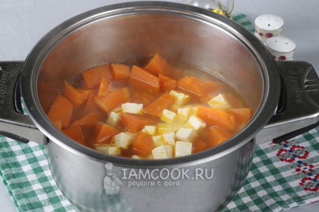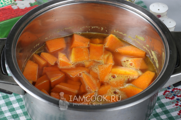 Налить в кастрюлю горячую воду и варить суп до мягкости тыквы.