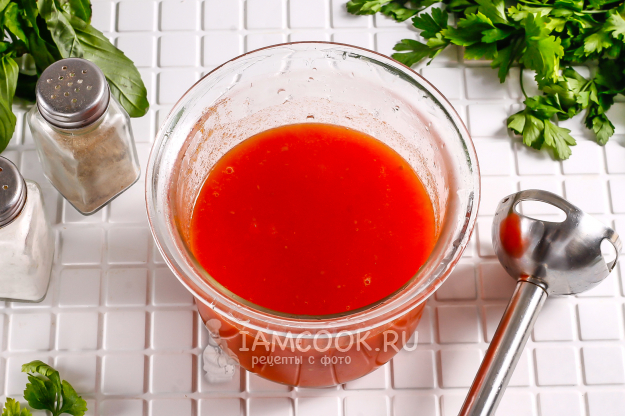 Перелейте содержимое в глубокую емкость для погружного блендера и отпюрируйте примерно 1-2 минуты. Добавьте немного молотого черного перца.