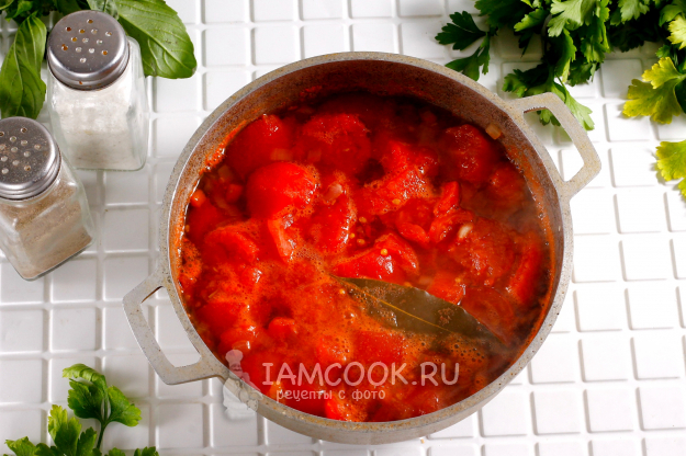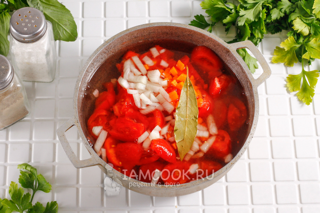 Нарежьте очищенные томаты ломтиками прямо в кастрюлю или небольшой казан. Нарежьте лук и морковь мелкими кубиками и добавьте к помидорам. Всыпьте соль и лавровые листья, влейте горячую воду и поместите емкость на плиту.