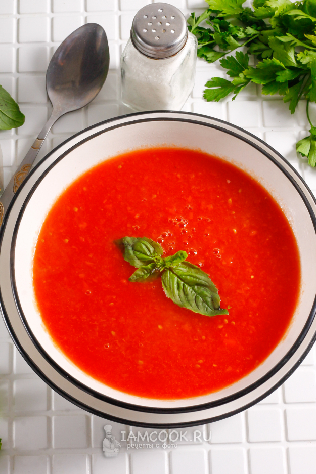 Перелейте теплый диетический томатный суп в глубокие тарелки или пиалы, украсьте свежим базиликом или другой зеленью и подайте к столу. Можно дополнить гренками или сухариками, поджаренными тостами.
