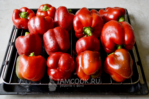 Перец вымойте, немного обсушите, переложите на противень на решетку и поставьте в разогретую до 200°С духовку. Запекайте перец в течение 35-45 минут до черных подпалин. Во время запекания обязательно переворачивайте перец, чтобы равномерно запекся.
